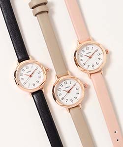 ピンクゴールドのケースや針、細めのベルトが女性らしい印象。