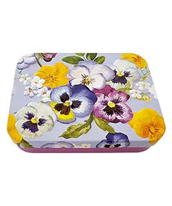 ビオラデザインにエンボス加工を施したお菓子缶。