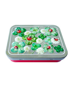 四つ葉のクローバーとテントウムシをあしらった、爽やかな印象のミニ缶。