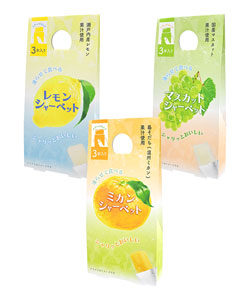 レモン(瀬戸内産レモン)、マスカット(国産マスカット)、ミカン(温州ミカン)の3種類。