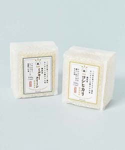 やわらかくきめ細かい粘り気のあるコシヒカリ、つやがありもっちりとした食感のミルキークイーン。