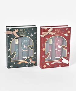 ブック型パッケージの中には、眠りの森をテーマにした優しい香りのハンドクリームとオードトワレが入っています。
