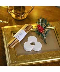 「HAPPY HOLIDAY」のメッセージ入りのラベルの付いたパロサントと専用ホルダー、ミニブーケがセットになったクリスマス限定セットです。