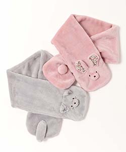 ウサギとネコの顔やしっぽが付いたネックウォーマー。