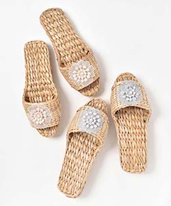 ナチュラルなガマ草の風合いと、可愛らしいフラワーモチーフが魅力のスリッパ。