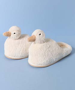 あひるのぬいぐるみがそのままスリッパになったようなユニークなデザイン。