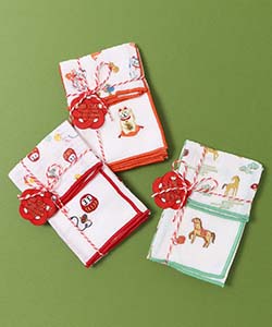 だるま・招き猫・うまの3種類、総柄とワンポイント刺繍入りの2枚セット。