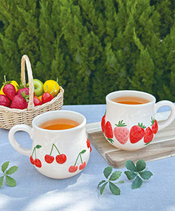 美味しそうなフルーツが並んだマグカップ。ぷっくりフルーツが可愛いマグカップ🍓🍒