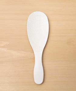 ご飯がこびりつきにくい特殊エンボス加工、手にフィットするグリップ、背面の突起で平置きした時に先端が浮いて衛生的など機能面に優れています。