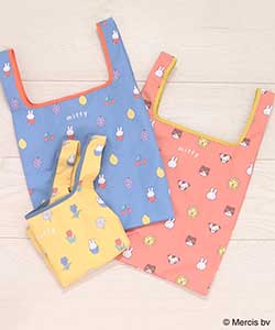 ミッフィーと仲間たち、お花やフルーツのモチーフが散りばめられた、ポップで楽しい総柄デザインのエコバッグ。