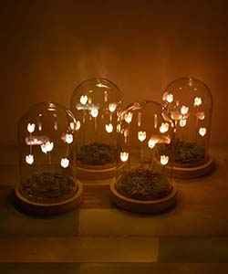 ガラスボールの中にはドライモスとチューリップのライトが入っていて暗い場所で光る姿は幻想的、テーブルや棚に置くだけで癒しの空間が広がります。
