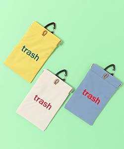 カラーはグレージュ・レモン・ブルーの3色展開、「trash(ゴミ)」のロゴ刺繍入りです。