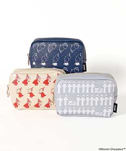 ムーミンの怒った顔や、ニョロニョロ、リトルミイのちょっぴりシニカルな表情がリズミカルに並んだ、遊び心あふれるスクエアポーチ。