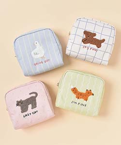ゆるーい表情のといぷー・あひる・きつね・ねこの4種類、モコモコのサガラ刺繍がポイント。