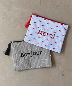 フランス語の「Merci」「Bonjour」の刺繍やタッセルがポイントのフラットポーチ。