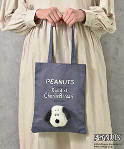 ふわふわなスヌーピーのマスコット付きのトートバッグ。