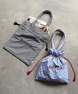 フランス語の「Merci」「Bonjour」の刺繍がポイントのトートバッグ。