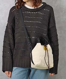 収納口のコードロープをキュッと絞ればコロンと可愛らしいシルエットの巾着型に◎。