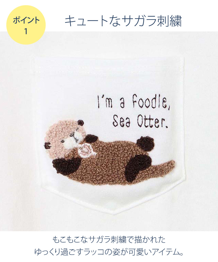 のんびり過ごすラッコの姿が、もこもこしたサガラ刺繍でキュートに表現されています。