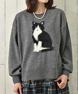 ふわふわな毛並みが愛らしいネコが大きくデザインされたニットプルオーバー。