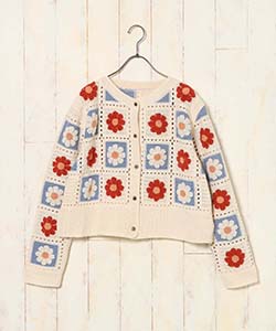 モコモコしたフラワーモチーフのサガラ刺繍が目を引くカーディガン。
