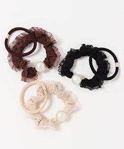 シンプルなゴムで髪の毛を簡単にまとめたり、大きなパールがポイントのシュシュで華やかさをプラスするなど様々な使い方が楽しめるアイテム。