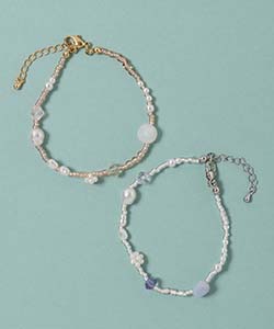 シンプルなビーズブレスレットに綺麗な天然石やパールで飾られた大人可愛いデザイン。