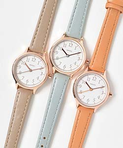 ベルトと同じ色の秒針が程よいアクセントで、シンプルながら遊び心のあるアイテム。
