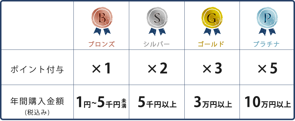 お買い物金額に応じた会員ランクがあり、会員ランクが上がるとポイント付与率が高くなる等の特典があります。